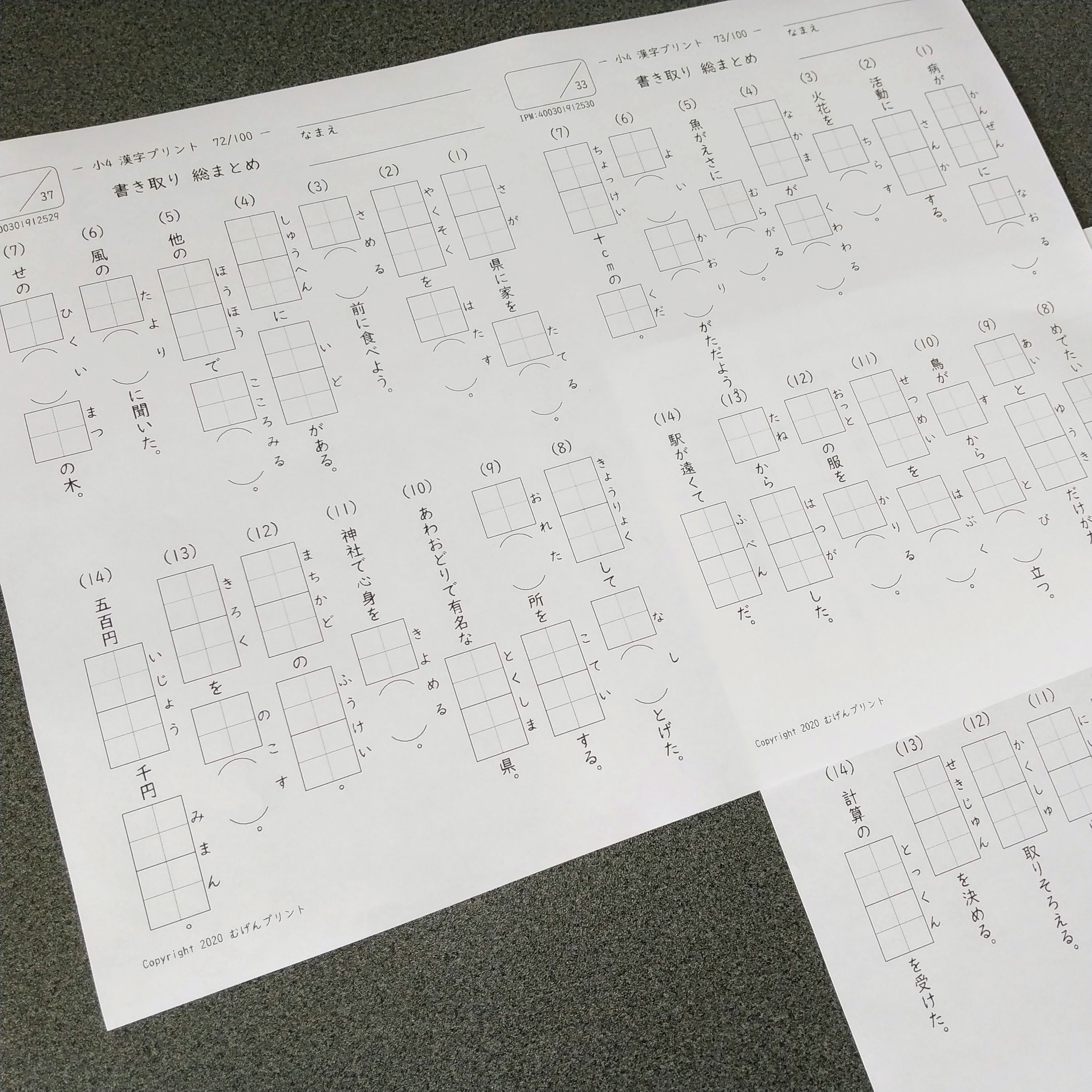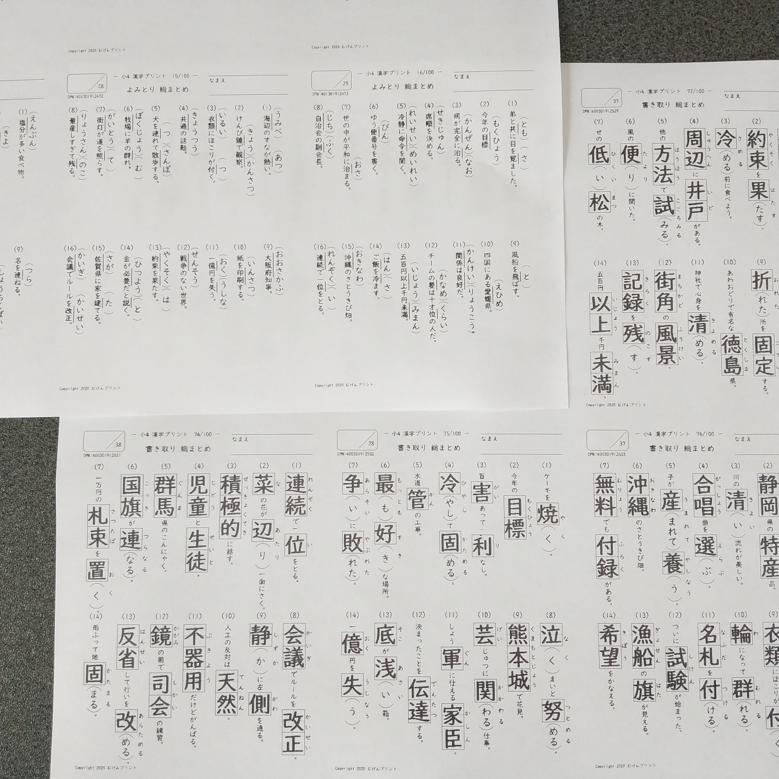 小学4年で習う漢字202字をすべて出題したプリント100枚、2983問です(漢検7級レベル)。
