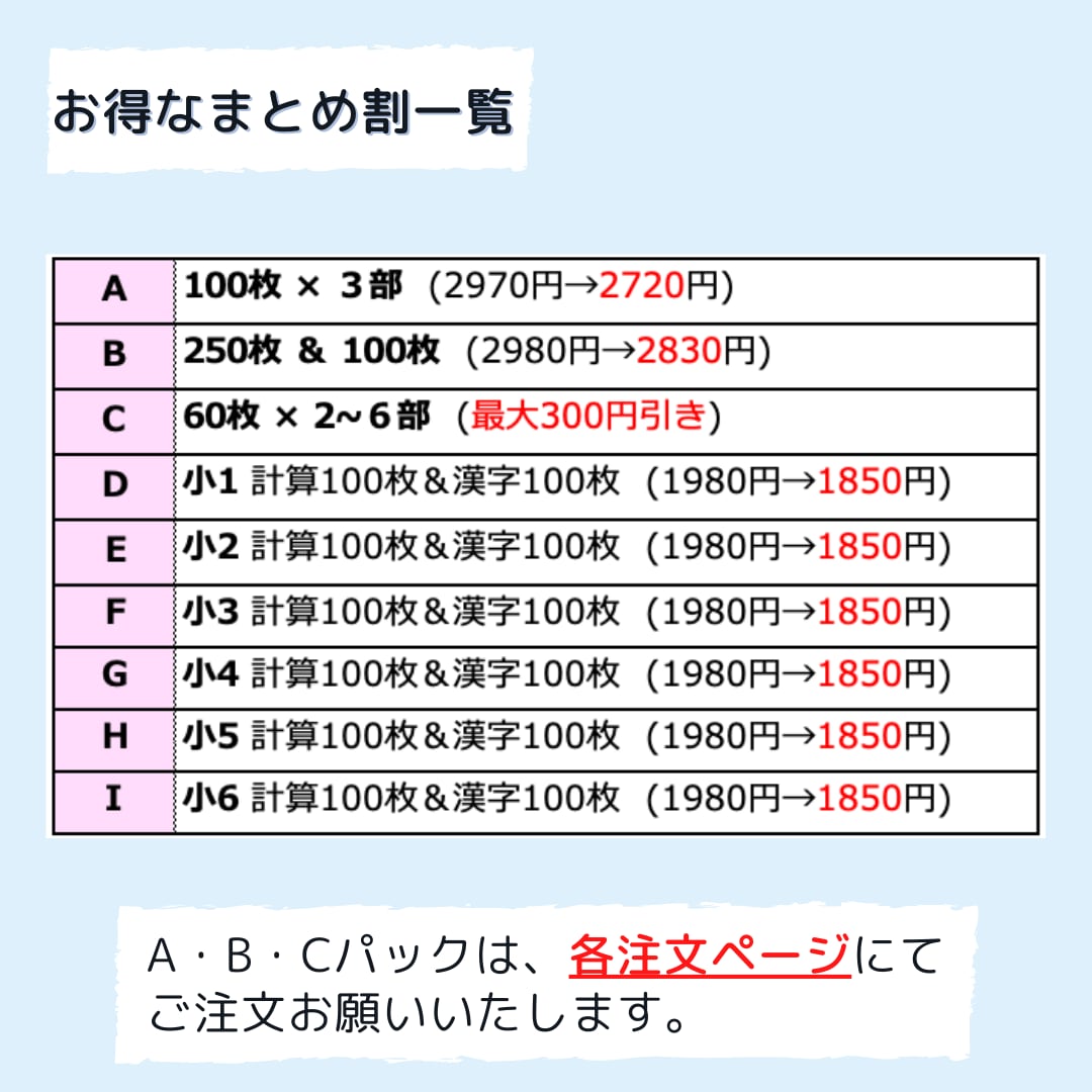 ・OPP袋入りで、A4に2回分を片面印刷してお送りいたします。ご家庭で切ってご使用ください。解答はA4に8回分です。