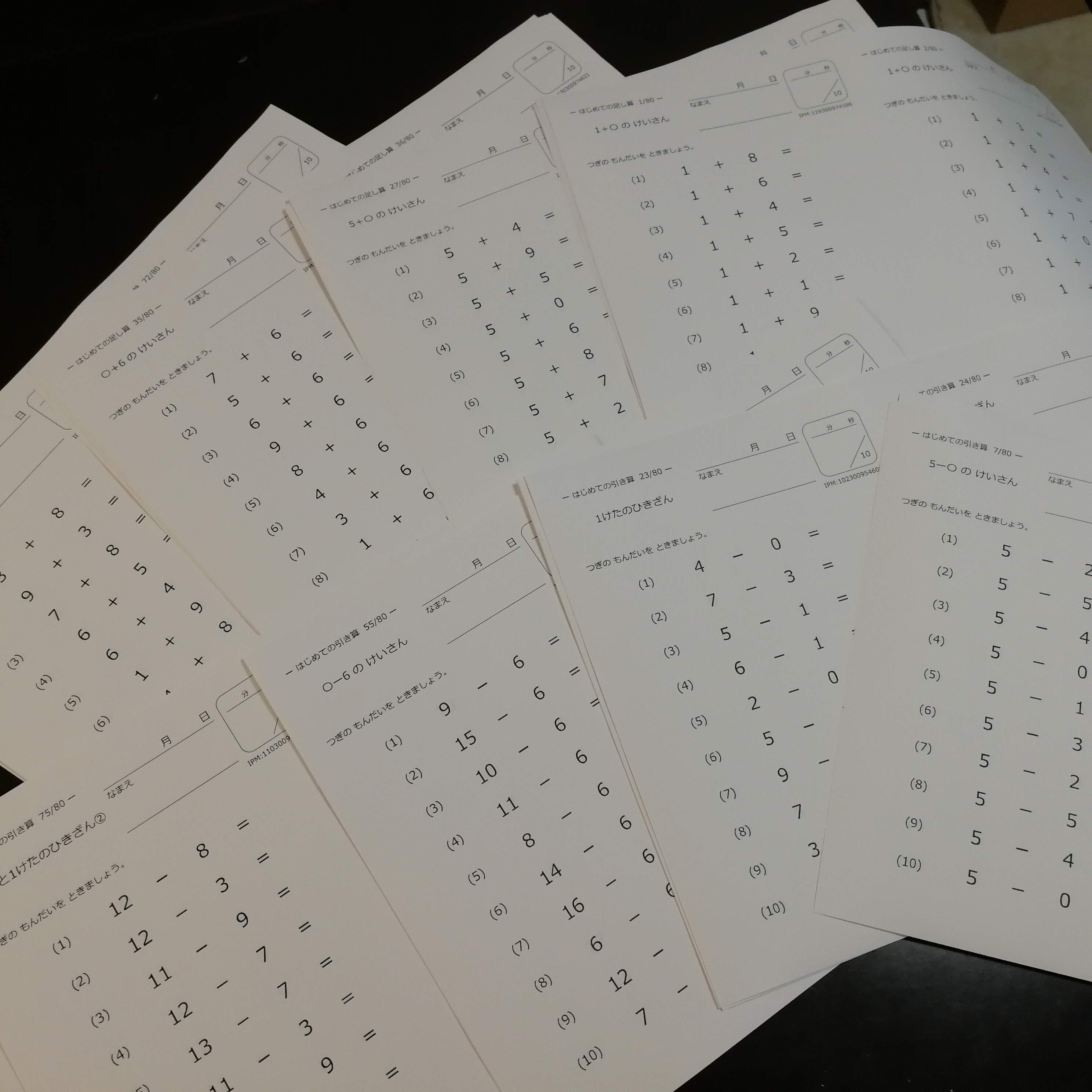 小学1年生の序盤で習う足し算引き算を、よりスモールステップにした計算プリント250枚です。