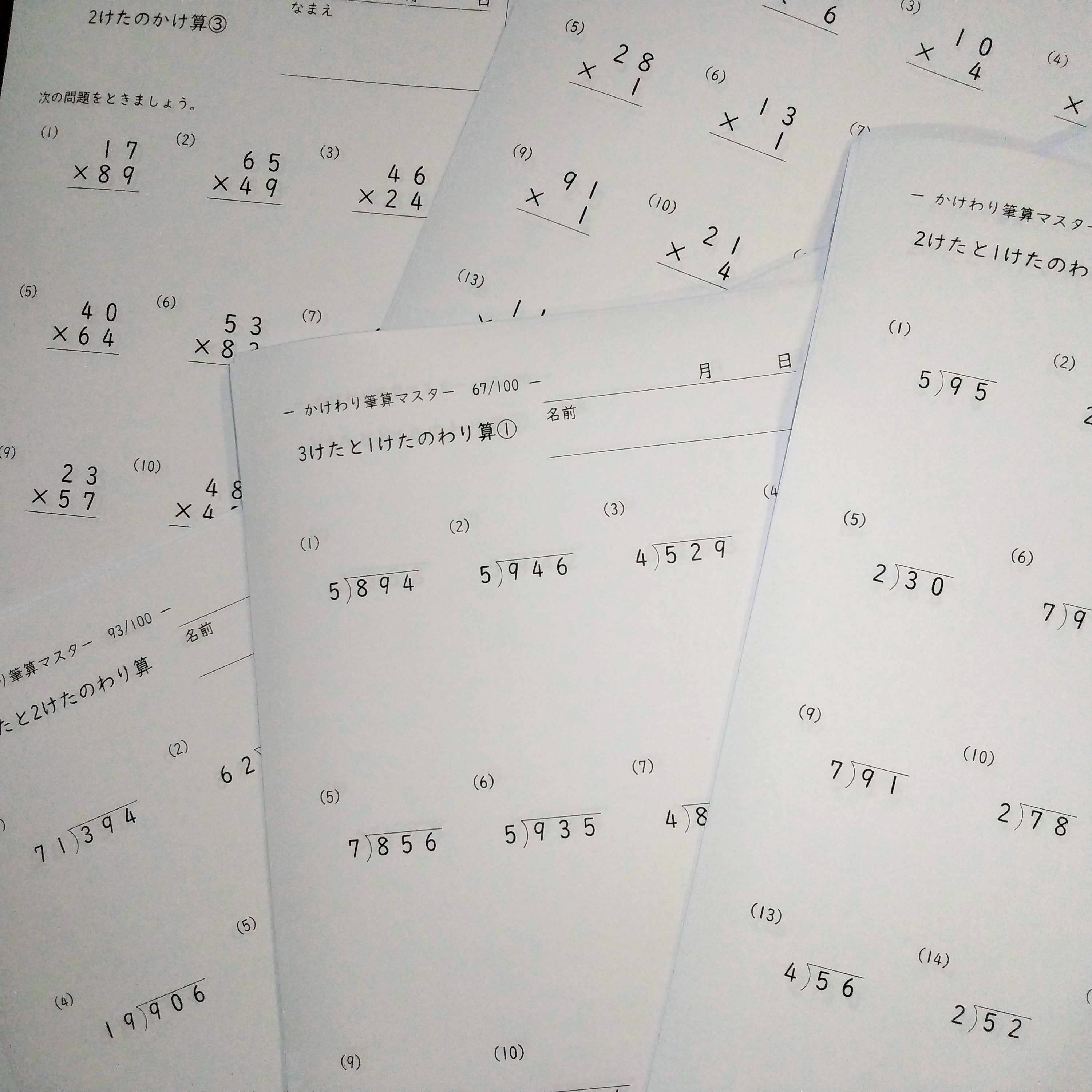 小学3年4年で習う「かけ算とわり算のひっ算」だけを集めたプリント100枚です。